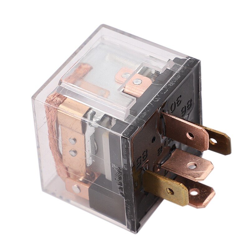 A high-current automotive relay that physically disconnects the propulsion system from the power source when the emergency stop circuit is triggered.